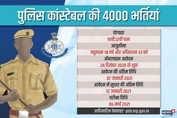 4000 कांस्टेबल के पदों पर ऑनलाइन आवेदन की प्रक्रिया 24 दिसंबर 2020 से शुरू हो गई है, जिसकी आखिरी तारीख 07 जनवरी 2021 है. आवेदन में करेक्शन की आखिरी तारीख 12 जनवरी 2021 है. इसके अलावा एमपी पुलिस कांस्टेबल के लिए परीक्षा 06 मार्च 2021 को होगी.