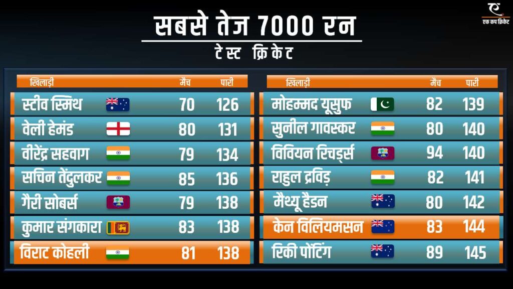 टेस्ट क्रिकेट के इतिहास में सबसे तेज सात हजार रन पूरे करने वाले नंबर 1 बल्लेबाज ऑस्ट्रेलिया के स्टीव स्मिथ है। स्मिथ ने 2019 में पाकिस्तान के विरुद्ध खेलते हुए 70वें टेस्ट की 126 इनिंग्स में 7000 रनों का आंकड़ा पार किया था। इसके बाद इंग्लैंड के वेली हेमंड लिस्ट में दूसरे पायदान पर हैं। जिन्होंने 80 टेस्ट की 131 पारियों में 7000 रन पूरे किए थे।