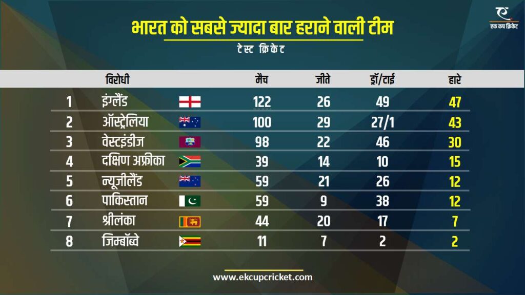 भारत को टेस्ट क्रिकेट में सबसे ज्यादा बार हराने वाले टीमों की लिस्ट